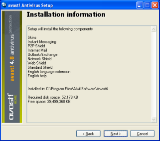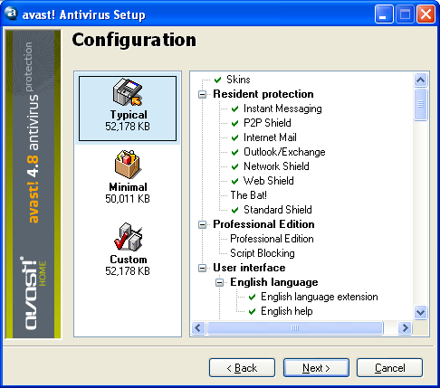 As you can see, the difference between a full installation and a “minimal” one amounts to 2MB. The optional component is “Skins”, which can change program appearance. Personally, I dislike skins, as they can move buttons and other screen components around and make it difficult to give proper instructions to users, but they’re part of the default installation. There is a repository of different Skins for Avast! on its web site, some of which are decidedly less horrible than the default one.