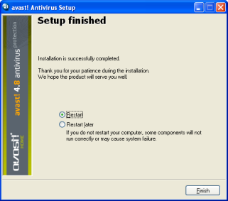In either case, users will have to click Finish; the computer will ultimately have to be restarted before Avast! will begin to function.
