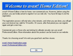 When a computer with an unregistered copy of Avast! Home Edition is restarted, this message is displayed.
