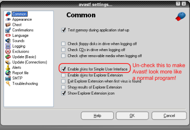 In the Common settings area, un-checking “Enable skins for Simple User Inferface” makes Avast! look more like a normal Windows program, instead of something not unlike a brushed-metal VCR.
