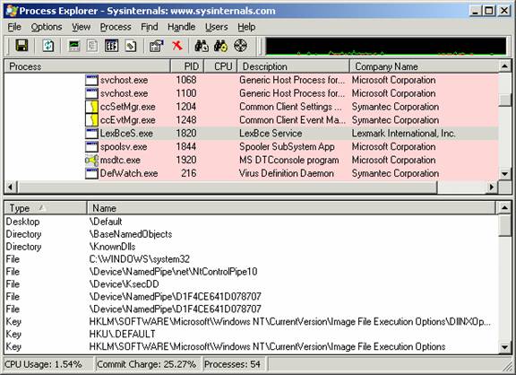 Process Explorer goes into somewhat more detail about the programs running on a computer. In this case, we can see that LexBceS.exe came from Lexmark, a company that makes printers. We can also see a list of files and registry entries associated with that program. This is exactly the sort of information one might need to know to take spyware off a computer!