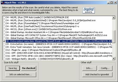 To remove any of the things that Hijack This has detected, simply check the box next to that line, then click the Fix Checked button. 99% of the time, if Hijack This is being run from safe mode, the item or items you have objected to will be removed forever.