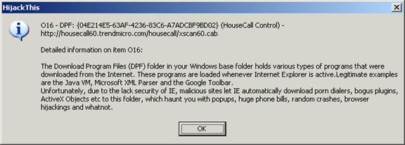 In the example here, we can see O4, O8, O9, O12, O16 and O20 changes. Clicking the Info on Selected Item button will explain the threat category in more detail. For example, an O16 threat describes an ActiveX program that has been downloaded and run by Internet Explorer. The O16-type threats visible in this scan, however, are both legitimate; one is from Housecall.Antivirus.Com, the other is from Microsoft's Technical Download service.